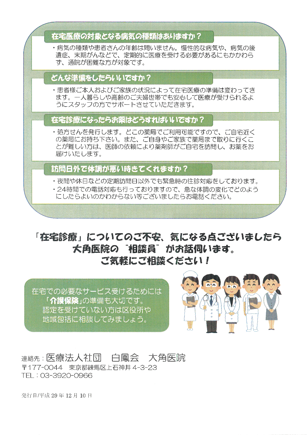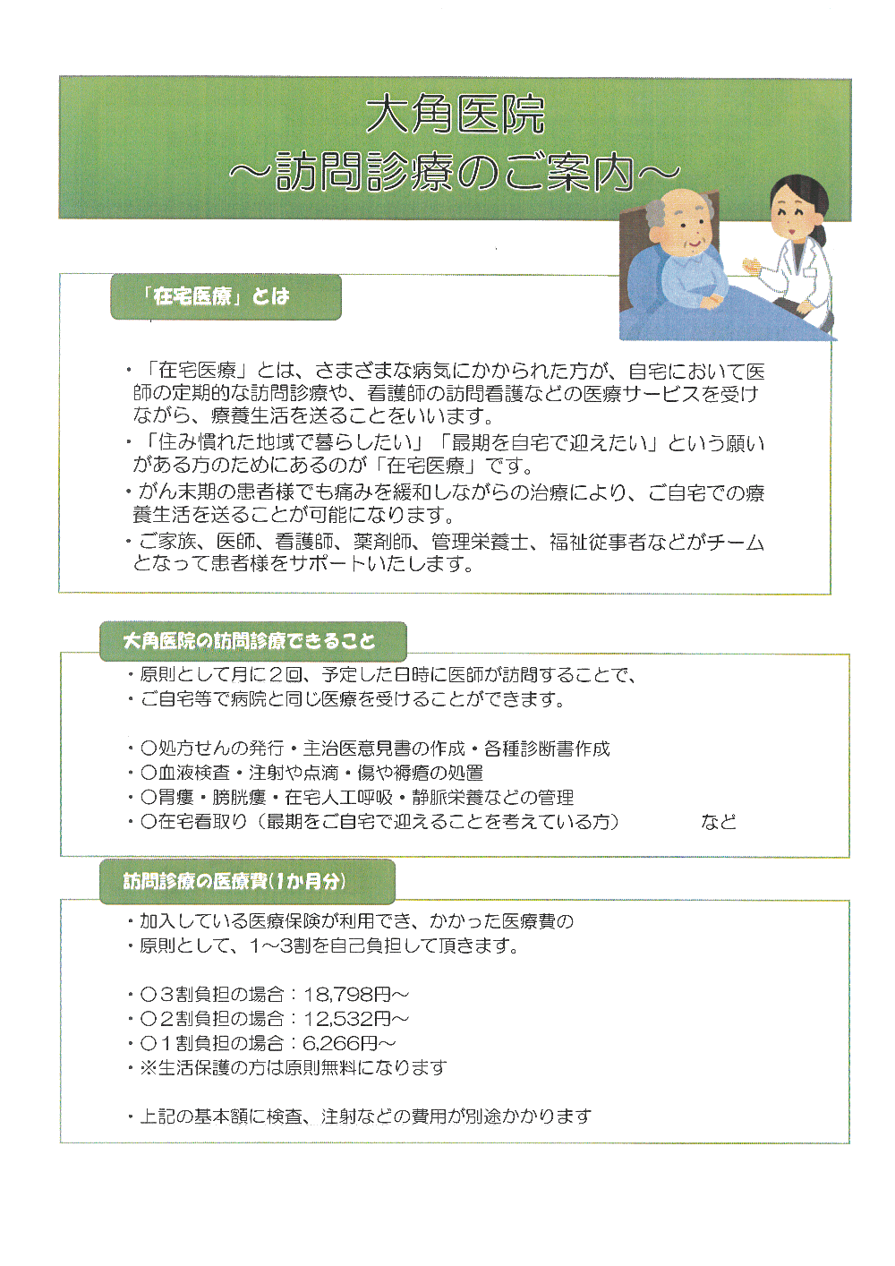 訪問診療は原則として2週間に1回、予定した日時に医師が訪問し、診察、検査、薬の処方を行います。